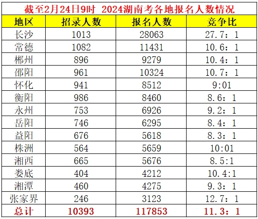 【截至2月24日9时】2024湖南省公务员报名人数约11.8万人,最热职位555:1