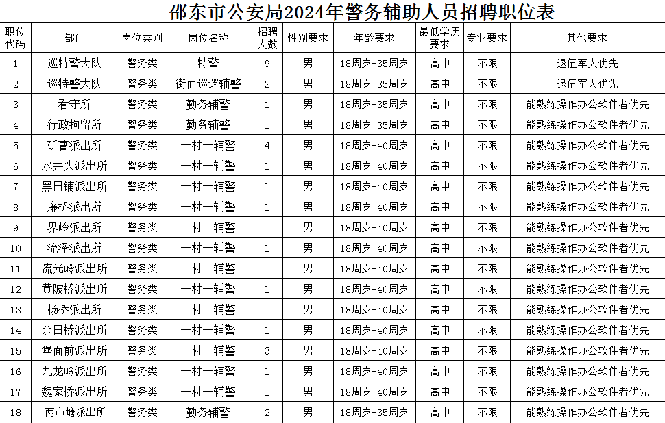 本次计划招聘共33人。具体的招聘职位、人数、资格条件等详见《邵东市公安局2024年警务辅助人员招聘职位表》。