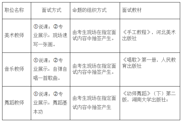 采取临时抽签的方式确定具体内容。面试采取说课和专业展示的形式进行,说课准备时间20分钟,正式面试时间为说课15分钟、专业展示5分钟。报考同一职位的考生使用同一试题,满分为100分。具体面试要求如下: