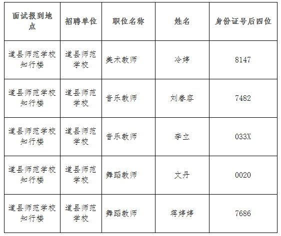 根据笔试成绩和资格复核,共有5人参加道县师范学校本次面试,名单附后。