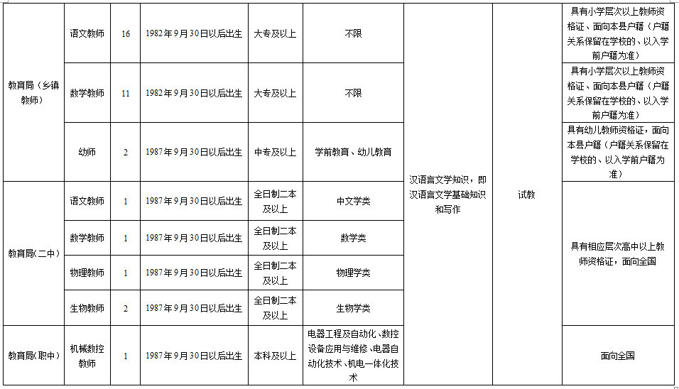 (1)笔试内容:教师类职位笔试内容为汉语言文学知识,即汉语言文学基础知识和写作;其余职位笔试内容为相应职位的专业知识(具体考试内容见招聘计划与职位条件表),笔试满分100分,占综合成绩的60%。