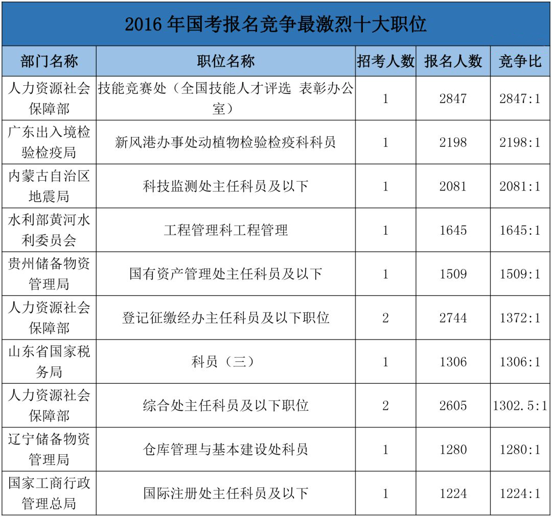 查看职位表,其实人力资源社会保障部整体报考门槛相对不高,可以报考的考生众多,造成竞争十分激烈。2016年国家公务员考试全国报考人数最多的十大职位里,人力资源社会部的一职位——技能竞赛处(全国技能人才评选表彰办公室)以2847人的庞大报名人数与2847:1的超高竞争比荣居榜首,2017年国家公务员考试中以1128:1上榜前十热门职位。