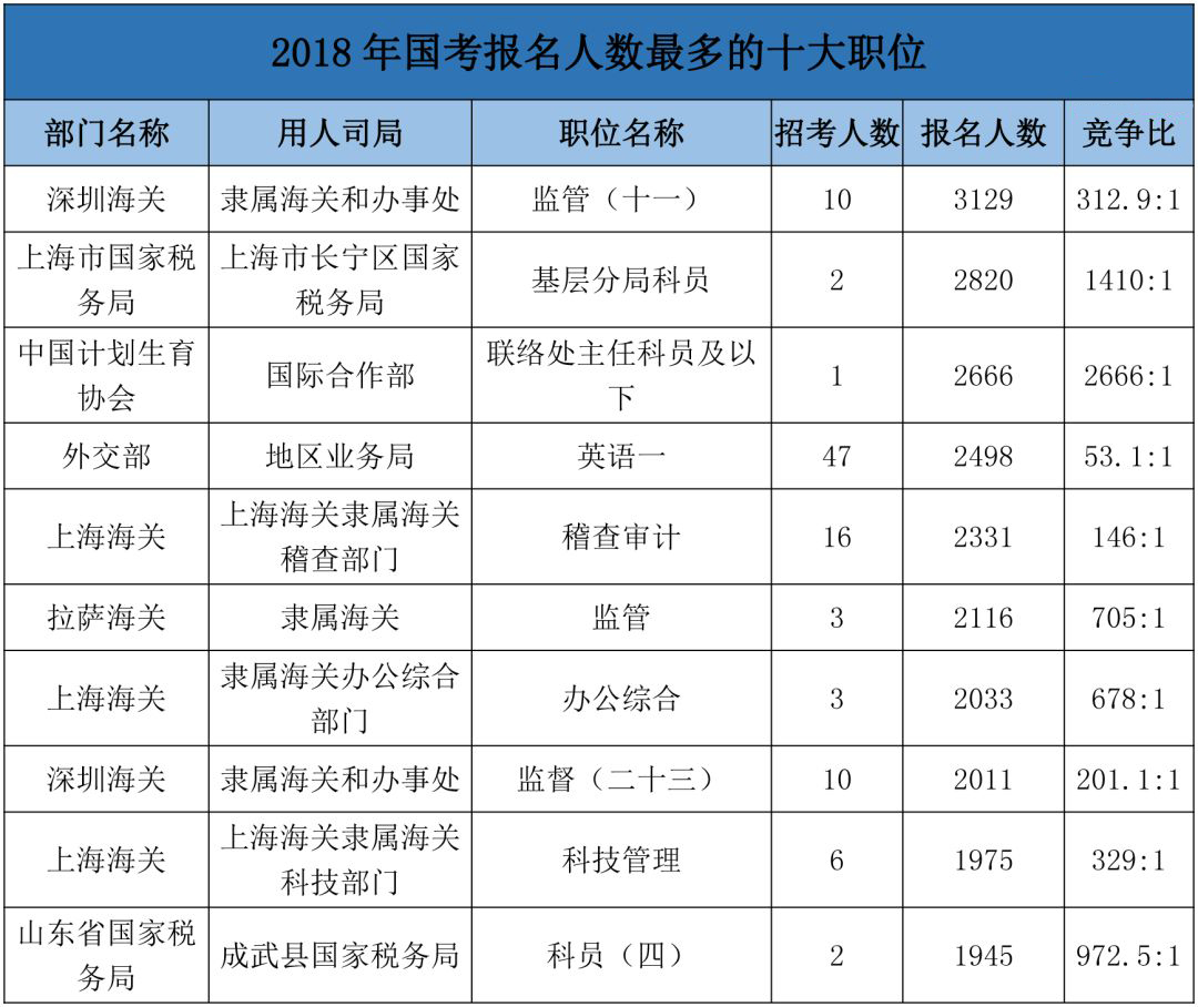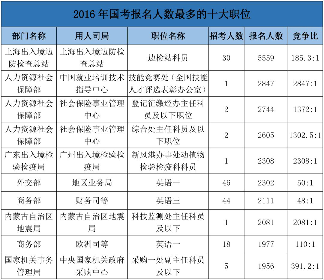 看完了国考招录人数最多的十大部门,我们来看看看往年国考竞争最激烈的十大职位以及报考人数最多的十大职位。(注:表格中的报名人数实为合格人数)