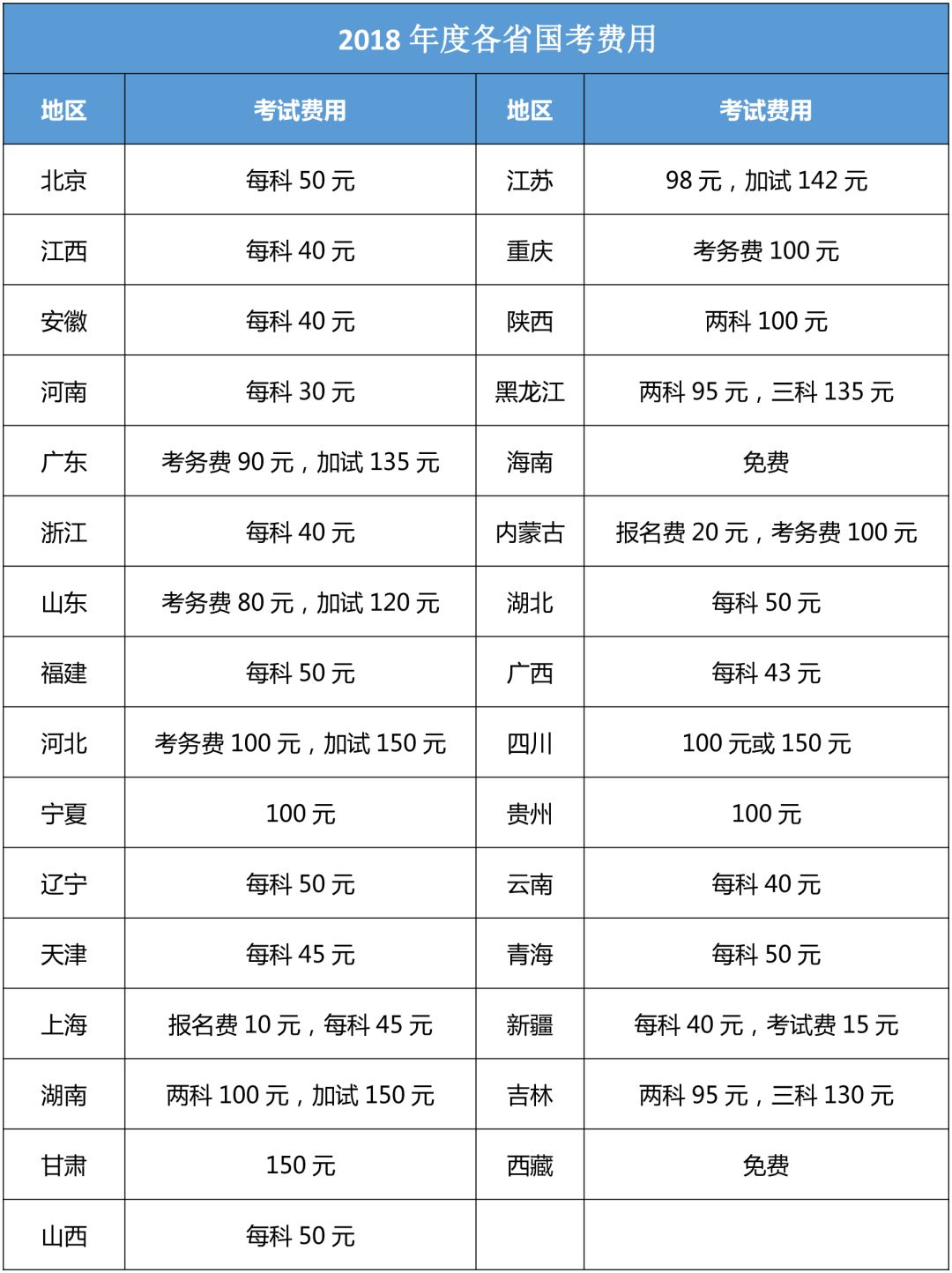 下面是2018年度各省国考费用参考表,考务费用以当地财政、物价部门核定的标准为依据。具体费用以最新要求为准。